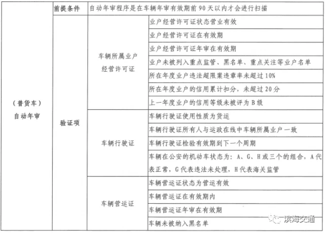 自动审核的频率,从每月1号开始,每3天对当月年审到期的个体业户和车辆进行扫描判断,并按照系统设定条件进行审核;每月的最后一天对当月年审到期,仍未年审的个体业户和车辆进行自动审核。审核结果可以通过“滨海交通”微信公众号绑定业户和车辆信息进行查询。
